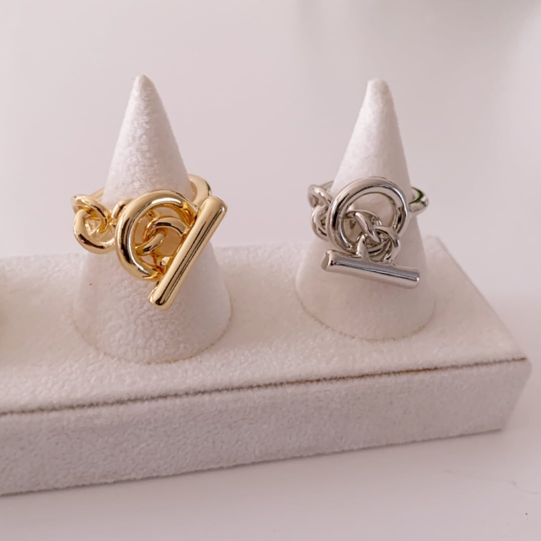 存在感のあるチェーンモチーフと、バーを組み合わせたデザインリング。